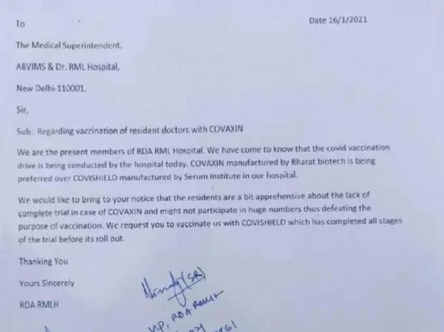 The coronavirus vaccination campaign started in the country from today. But even before the vaccination drive has begun a major development has taken place in Ram Manohar Lohia Hospital in Delhi. The resident doctor of the hospital has written a letter to the medical superintendent of the hospital demanding that the Covishield vaccine be given instead of the covacin vaccine.