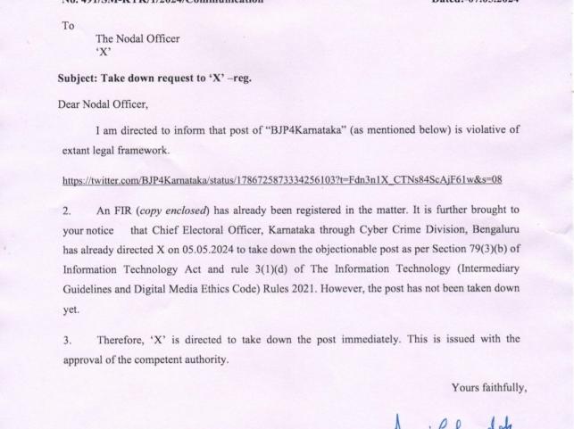 "An FIR (copy enclosed) has already been registered in the matter. It is further brought to your notice that Chief Electoral Officer, Karnataka through Cyber Crime Division, Bengaluru has already directed X on 05.05.2024 to take down the objectionable post as per Section 79(3)(b) of the Information Technology Act and rule 3(1)(d) of The Information Technology (Intermediary Guidelines and Digital Media Ethics Code) Rules 2021. However, the post has not been taken down yet," the EC letter said.