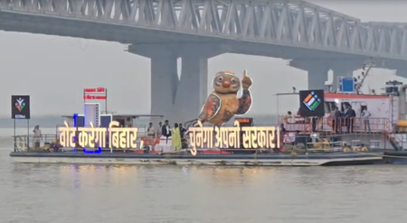 As thousands of devotees gathered at various Chhath Ghats across the state to offer Arghya (prayers) to the setting sun, a steamer on the Ganga River in Patna drew attention with banners and slogans promoting voter participation.