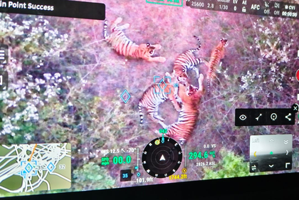 During drone surveillance, forest officials detected pugmarks of a tigress and her cubs at the stone quarry, confirming the presence of all five tigers in the area.
