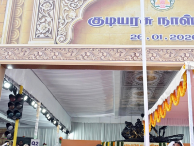 The main Republic Day function in Chennai was held near the Workers’ Statue on Kamaraj Salai. Chief Minister Stalin arrived at the venue under a strong police escort, with patrol vehicles positioned both in front of and behind his convoy. Governor R.N. Ravi later arrived at the venue, accompanied by his wife, Lakshmi Ravi, escorted by a ceremonial motorbike contingent of the Indian Air Force.