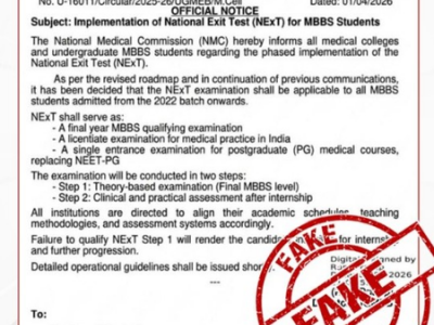 The PIB cautioned against taking the claims of the letter as true. The “fake” letter says that the NExT examination will be conducted in two steps: Step 1: Theory-based examination (Final MBBS level) and Step 2: Clinical and practical assessment after internship.
