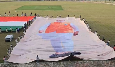The massive poster, crafted on fabric by a local artist Praveen Gupta, took over 10 days to complete. It required 54 people to unfold the 250 kg fabric creation. Alongside it, a 30x20 ft tricolor flag was also hoisted and will be displayed during the upcoming India-Sri Lanka women's cricket tournament hosted at the stadium.