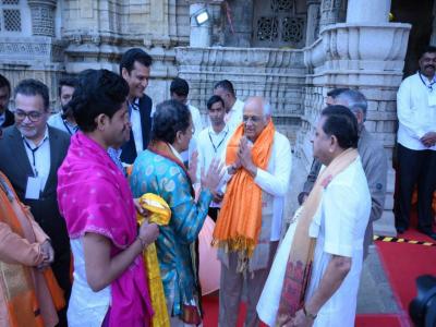 The district administration presented Patel with an uparna, a replica of the Dwarka Temple, flowers, Anugraham agarbatti (incense sticks) made from flowers and tulsi, and prasad.