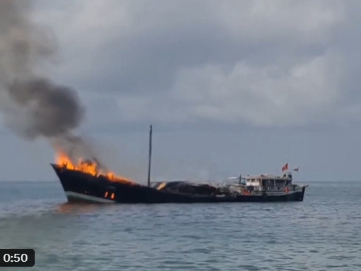 The ship was towed to the middle of the sea as the fire intensified due to the flammable materials onboard, which further fueled the flames. The fire is said to have started in the engine room, from where thick black smoke spread over the sea.