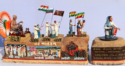 The concluding segment featured a sculpture of Mahatma Gandhi with the charkha alongside a prominent Dharma Chakra, symbolising the ideals of swadeshi and self-reliance.