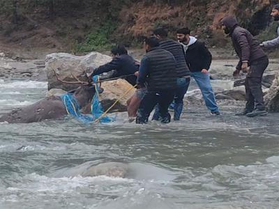According to the information received, villagers informed the forest department last evening that a Sambar was lying injured on the banks of the Tirthan River. Upon receiving the information, the forest department team arrived at the site with a tranquilliser gun. The Sambar got scared on seeing the team.