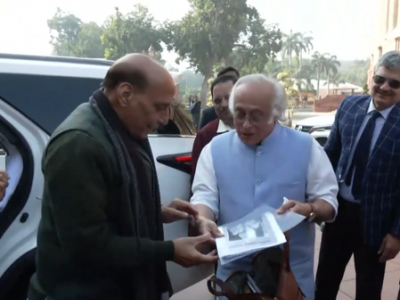 New Delhi, Dec 11 Congress MP Jairam Ramesh on Thursday handed over a set of pages from the book 'Inside Story of Sardar Patel: The Diary of Maniben Patel' to Defence Minister Rajnath Singh as he arrived in Parliament for the day's proceedings.