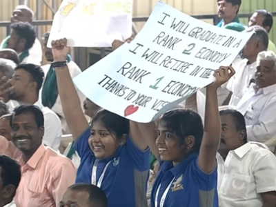 Sringa, a Class 8 student, stated: “When I graduate, the Indian economy will be second in the world, and when I retire, it will be first. I want to thank the Prime Minister for this future.”
