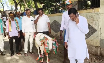 As part of the Bagalkot Assembly bye-election, Congress candidate Umesh Meti cast his vote at Booth No. 39 in his native village, Timmappur. He arrived near the polling booth with a ram (adult male sheep) adorned with Congress flags and later entered the polling station and cast his vote. It may be noted that Umesh Meti hails from the shepherd community.