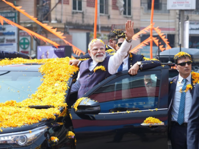 During the 20-minute roadshow, Prime Minister Modi cheerfully greeted the crowd, waved at them, and at several points raised both hands to acknowledge their greetings.