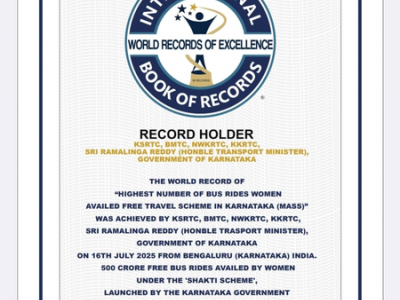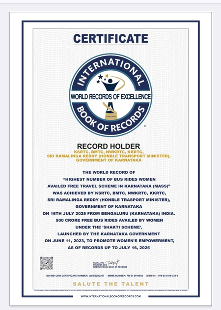 The certificate further mentioned, "The world record of highest number of bus rides women availed via the free travel scheme in Karnataka (mass) was achieved by KSRTC, BMTC, NWKRTC, KKRTC, Minister Ramalinga Reddy, government of Karnataka on July 16, 2025 from Bengaluru (Karnataka) India. 500 crore bus rides availed by women under the Shakti scheme, launched by the Karnataka government on June 11, 2023, to promote women's empowerment, as of records up to July 16, 2025."