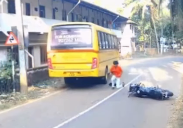 A potentially fatal accident was narrowly averted in Pajamallur, located in Kerala’s Malappuram district, after a student lost control of his motorcycle due to a sudden deterioration in his health. The incident occurred when the student, while riding along a busy stretch of road, became unwell, lost his balance and fell directly in front of an oncoming bus. Alertness and quick reflexes on the part of the bus driver prevented a major tragedy. The driver immediately applied the brakes, bringing the vehicle to a halt just in time and avoiding a collision. The dramatic near-miss was captured on nearby CCTV cameras, with the footage later circulating widely and drawing attention to the driver’s presence of mind.