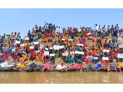 Tribal women gathered on the river shore and raised slogans and placards against the government project.