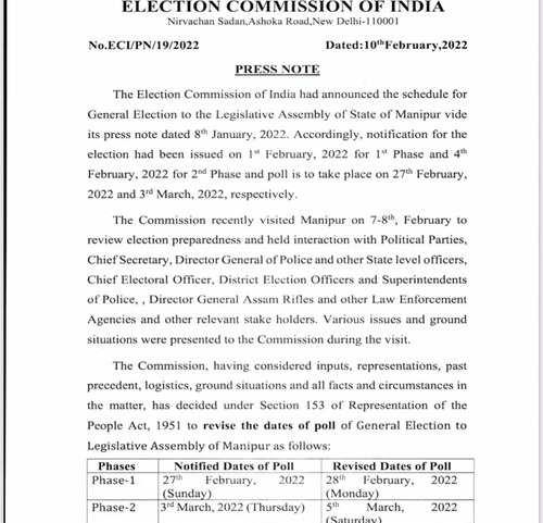 "The Commission, having considered inputs, representations, past precedent, logistics, ground situations and all facts and circumstances in the matter, has decided under Section 153 of Representation of the People Act, 1951 to revise the dates of a poll of General Election to Legislative Assembly of Manipur 27th Feb to 28th Feb 2022 for phase 1. For phase 2, 3rd March to 5th March" it stated.