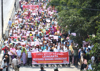 On Saturday, thousands of people, including many women from across the Imphal Valley, participated in a protest rally organised by the Coordinating Committee on Manipur Integrity (COCOMI), an apex body representing the Meitei community.