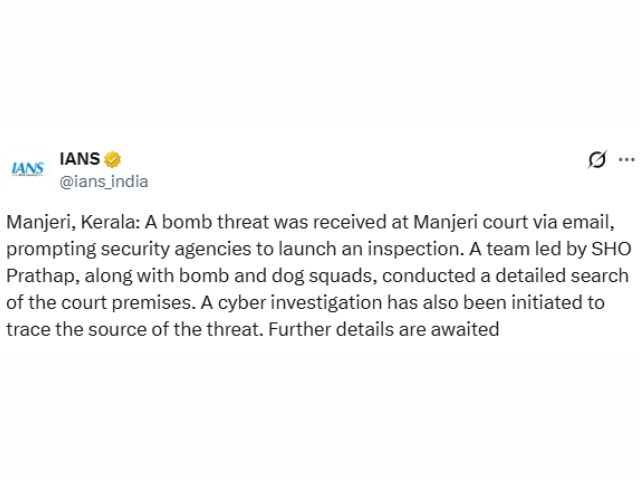 An email warning about a possible bomb at the Manjeri court triggered an immediate response from law enforcement agencies on Friday, reported IANS. Acting swiftly, a police team headed by Station House Officer Prathap reached the court complex and began precautionary measures. Bomb disposal experts and a trained dog squad were deployed to thoroughly scan the entire premises to ensure the safety of staff, lawyers and visitors. Authorities confirmed that a cyber probe has been launched to track the origin of the threatening email and identify those responsible. Officials said more information will be shared after the investigation progresses.