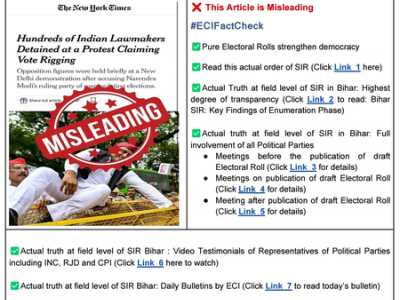 In a fact-check issued to rebut the NYT news report with the headline “Hundreds of Indian Lawmakers Detained at a Protest Claiming Vote Rigging”, the ECI shared a social media post carrying links to videos related to the “Actual truth at field level” of the ongoing Special Intensive Revision (SIR) in Bihar.