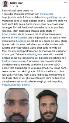 In a Facebook post, that is going viral on social media, gangster Brar called both slain shooters Jagroop Roopa and Manpreet Mannu as deadly lions who fought valiantly with the police force for over six hours.