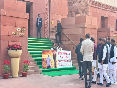 The INDIA bloc MPs carried a poster with the pictures of Prime Minister Narendra Modi and US President Donald Trump, and wrote, "Narender surrendered? The nation is watching."