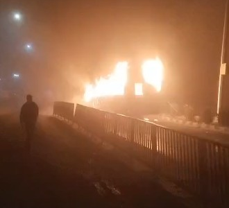 The incident took place around 5:15 a.m. in the Shri Dungargarh area when the bus, travelling from Jaipur to Bikaner, rammed into a stationary trailer, after which it was engulfed in flames.