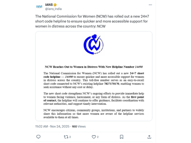 The National Commission for Women (NCW) has introduced a new 24×7 short code helpline — 14490, reported news agency IANS. This helpline is set up to offer faster and more accessible support for women facing distress anywhere in the country. The toll-free number is easy to remember and is linked to NCW’s existing helpline 7827170170, ensuring that women can seek immediate assistance without any cost or delay. The service aims to expand the reach of emergency support, especially for those encountering violence, harassment or unsafe situations, reported IANS. The helpline will serve as the first point of contact for women requiring urgent help and will guide callers through the process of intervention. The support system will continue to coordinate with relevant authorities and agencies to ensure a quick response and timely resolution of complaints. NCW has urged citizens, educational institutions, community organisations, and partner networks to widely circulate the helpline number to ensure that every woman is aware of the service available round the clock, reported news agency IANS.