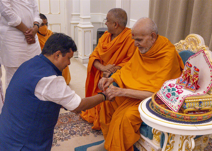 On Friday, Nabin was accompanied by senior party leaders, including Jagdish Vishwakarma, President of BJP Gujarat; B.L. Santhosh, National General Secretary (Organisation); and Ratnakarji, BJP Gujarat Organisation Secretary. The meeting was marked by warmth and reverence as the delegation sought the blessings of Mahant Swami Maharaj.