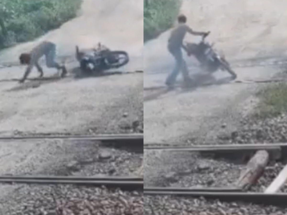 In video, Man on bike tries to cross the train track, but unfortunately his bike get stuck. He moves aside and then tries to remove the bike, not aware that speeding train is coming from behind. In the next moment he gets hit by a train. This incident has left everyone shock.