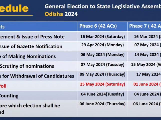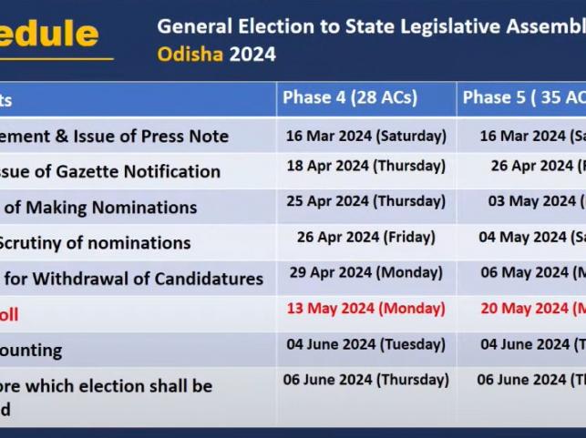 The Election Commission on Saturday, March 16, announced the schedule for assembly polls in Odisha. Elections will be held in Odisha on May 13, 20, 25 and June 1, 2024.