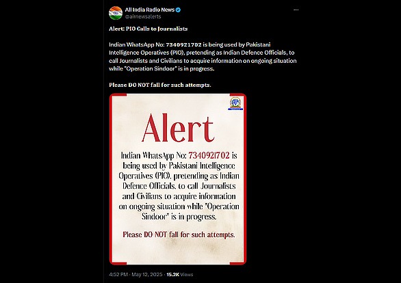 As Operation Sindoor continues to unfold, a new threat has surfaced in the form of psychological and digital warfare. Reports confirm that operatives from Pakistan's intelligence services (PIO) have adopted deceptive tactics, targeting Indian journalists and civilians through WhatsApp under the guise of Indian defence officials. A WhatsApp number—+91 7340921702—has been identified as one of the primary tools used by PIO to reach out to unsuspecting individuals. Posing as senior Indian military personnel, these operatives attempt to extract real-time information about India's internal security status, troop movements, and critical infrastructure. In response, the Ministry of Defence has issued a nationwide alert urging citizens to remain vigilant. “Please do not fall for such attempts,” the official statement read, emphasizing that no information should be shared with unknown callers, regardless of how credible they might sound.