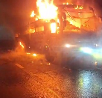 At around 5.15 a.m., smoke suddenly started billowing from the moving bus, and within minutes, the entire vehicle was engulfed in flames.
