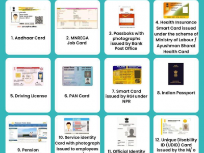 According to the Election Commission of India (ECI), acceptable documents include Aadhaar card, MGNREGA job card, passport, PAN card, driving license, smart card issued by RGI under NPR, pension document with photo, and health insurance or service ID cards, among others.