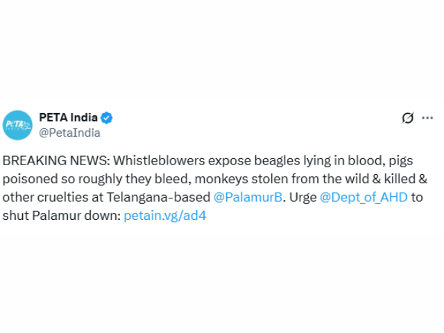 PETA India also posted some visuals on X. In an X post, it wrote, “BREAKING NEWS: Whistleblowers expose beagles lying in blood, pigs poisoned so roughly they bleed, monkeys stolen from the wild & killed & other cruelties at Telangana-based @PalamurB. Urge @Dept_of_AHD to shut Palamur down.”