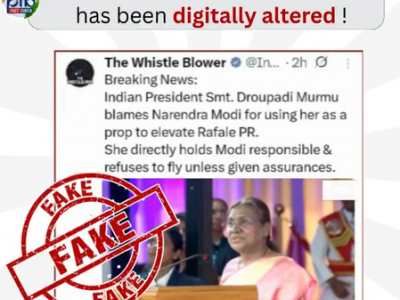New Delhi, Oct 29 PIB Fact Check on Wednesday flagged a digitally-altered video of President Droupadi Murmu that is being circulated by Pakistani propaganda accounts with false claims alleging that Prime Minister Narendra Modi is using her as a prop to promote Rafale fighter jets.