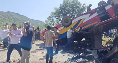 The cause of the accident was being ascertained, said the officials. The bus had turned turtle in the accident, and more details were awaited.