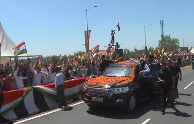 Participants showered flowers at PM Modi while holding the Tricolour in their hands and chanting slogans such as "Modi, Modi," "Bharat Mata Ki Jai," and "Jai Shri Ram."