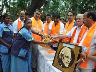 On the occasion of PM Modi's birthday, as part of a service-oriented fortnight campaign, Yediyurappa, on Wednesday, honoured 75 municipal workers at his Dhavalagiri residence in Bengaluru.