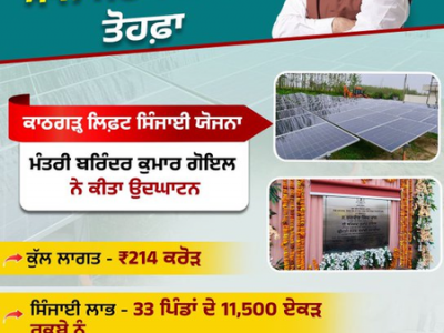 Marking a historic step, Goyal inaugurated the scheme developed at a cost of Rs 214 crore. For the first time, canal water has been successfully lifted and delivered to higher altitude areas, ensuring assured irrigation to dry and rain-fed lands of the Kandi region.