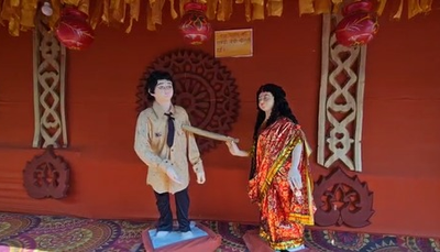 However, one of the most talked-about displays is a statue depicting RJD leader Rabri Devi beating her son, Tej Pratap Yadav, which has become a major attraction.