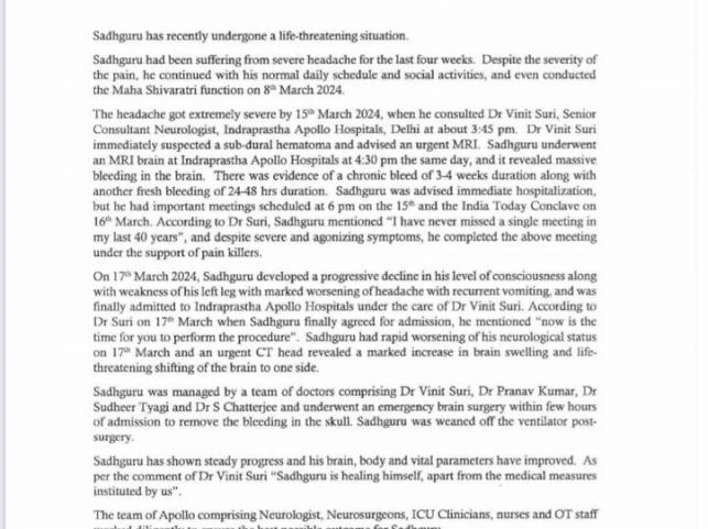 “On 17th March 2024, Sadhguru developed a progressive decline in his level of consciousness along with weakness of his left leg with marked worsening of headache with recurrent vomiting, and was finally admitted to Indraprastha Apollo Hospitals under the care of Dr Vinit Suri. According to Dr Suri on 17 March when Sadhguru finally agreed for admission, he mentioned "now is the time for you to perform the procedure". Sadhguru had rapid worsening of his neurological status on 17 March and an urgent CT head revealed a marked increase in brain swelling and life- threatening shifting of the brain to one side,” it added.