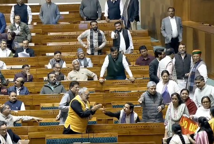 This is the first glimpse of the highly confrontational scene that occurred in the Lok Sabha during the debate on Motion of Thanks to the President's address. It captures the opposition MPs’ attempt to inflict hostility on the treasury benches while BJP MPs and ministers are seen urging them to protest, without crossing the boundaries.