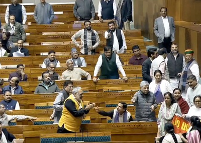 This is the first glimpse of the highly confrontational scene that occurred in the Lok Sabha during the debate on Motion of Thanks to the President's address. It captures the opposition MPs’ attempt to inflict hostility on the treasury benches while BJP MPs and ministers are seen urging them to protest, without crossing the boundaries.