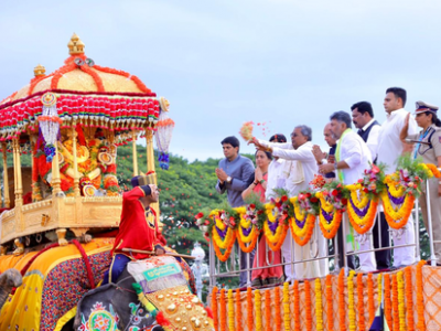 On the occasion of Vijayadashami, Siddaramaiah, Deputy Chief Minister D.K. Shivakumar, offered floral tributes to Goddess Chamundeshwari, who was carried in the golden howdah by Abhimanyu inside the Mysuru Palace premises.