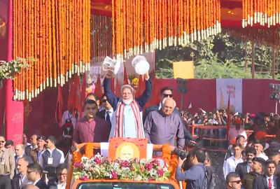 As the rhythm of the 'Damru', an instrument associated with Lord Shiva, filled the air, PM Modi was welcomed by large crowds lining the roads, eager to catch a glimpse of him.