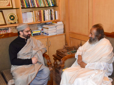Welcoming the spiritual guru, Mirwaiz Fraooq reiterated that the institution of the Mirwaiz remains committed to “peace and dialogue as the most humane and effective means of addressing issues and resolving differences.”
