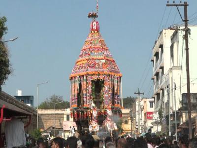The chariot carrying the main deity was first pulled and halted at the southwest corner, followed by the procession of Goddess Akilandeswari's chariot. Both chariots later completed their circumambulation of the four streets and reached their designated positions.