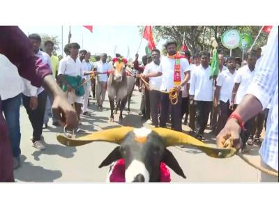 Tiruchirappalli, (Tamil Nadu) [India], March 31 : Accompanied by bulls, goats, and roosters, along with traditional drum beats. Jallikattu Rajesh, Naam Tamilar Katchi (NTK) candidate who is contesting from the Thiruverumbur Assembly constituency for the upcoming Tamil Nadu elections, filed his nomination.
