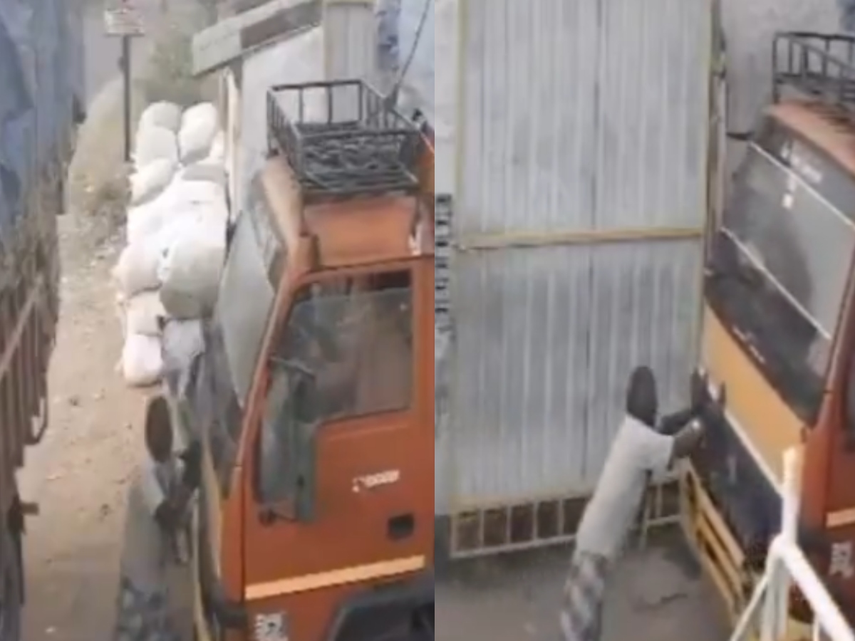 Footage shows workers wrapping up their regular work at an old shed. An elderly worker hands something to another worker and closes the door. As he starts to walk away, the lorry begins moving toward him. The older worker and two colleagues try to stop the lorry with their bare hands. While a younger worker moves to the other side, the man is unable to save himself and is tragically crushed when the lorry crashes into another truck.