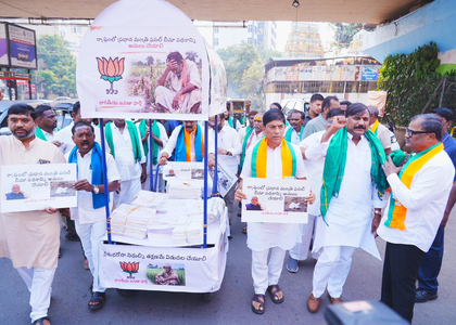 Hyderabad, March 17 The BJP MLAs in Telangana on Tuesday reached the Assembly with a pushcart carrying representations from farmers, demanding implementation of the Pradhan Mantri Fasal Bima Yojana in the state and resolution of various problems faced by them.