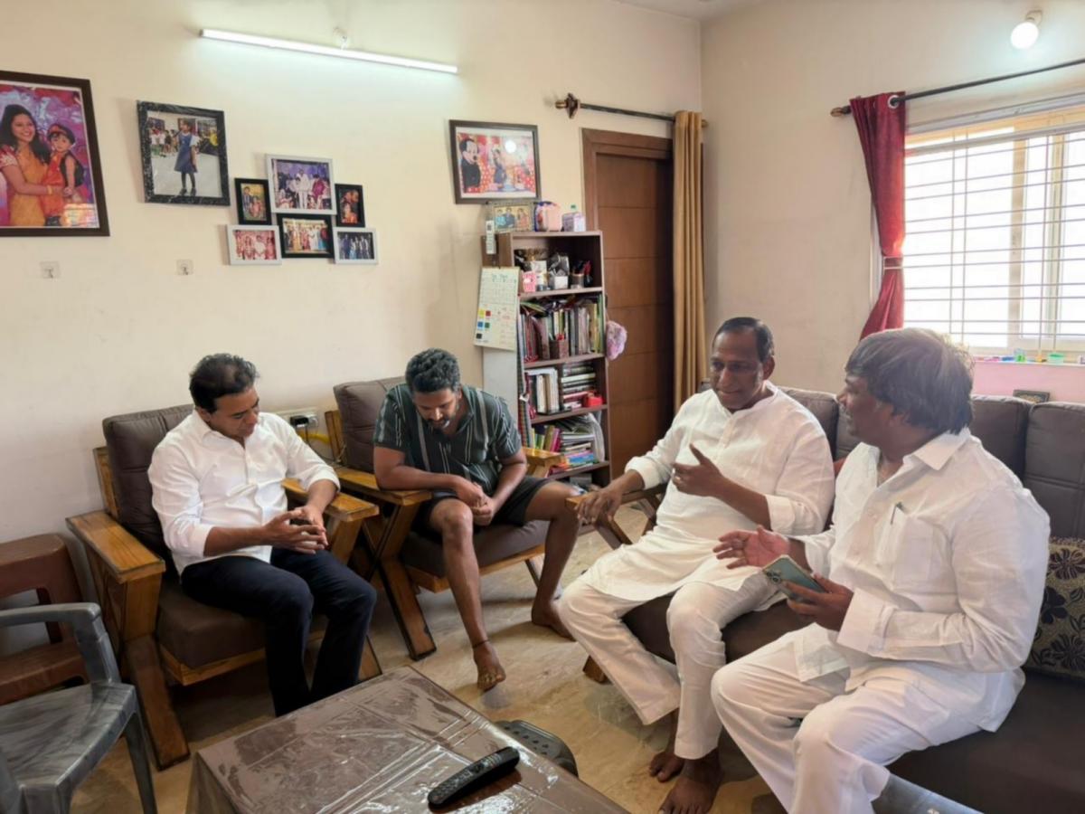 Krishank sustained severe leg injuries while burning an effigy during a recent dharna held against the Congress government at Picket. KTR did a courtesy visit to Krishank, who is currently receiving treatment at his residence in Picket, and inquired about his health condition.
